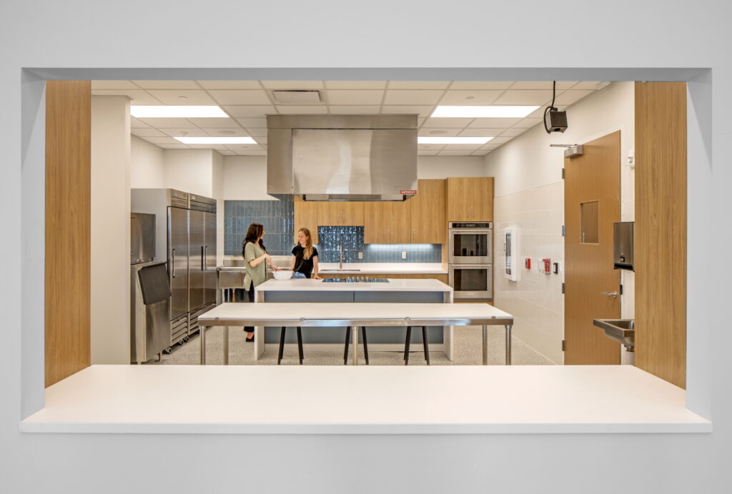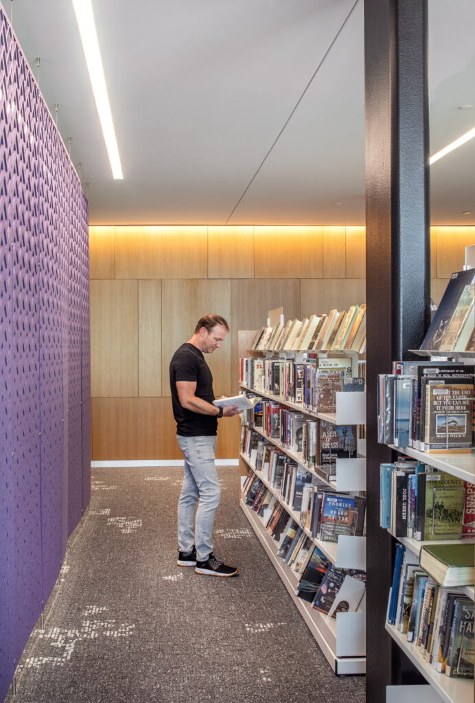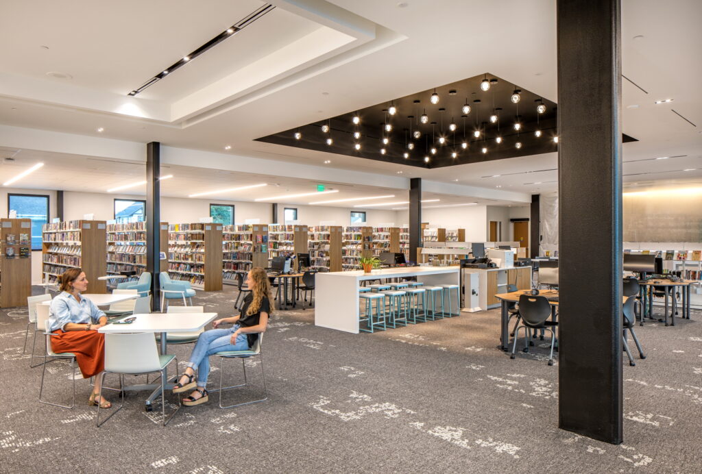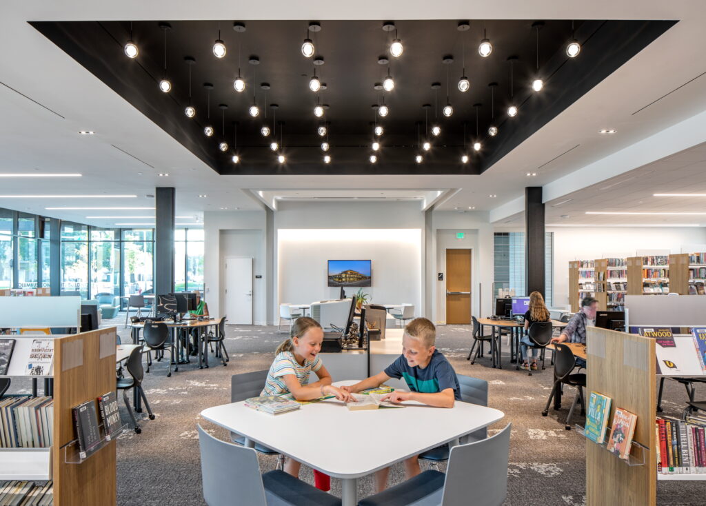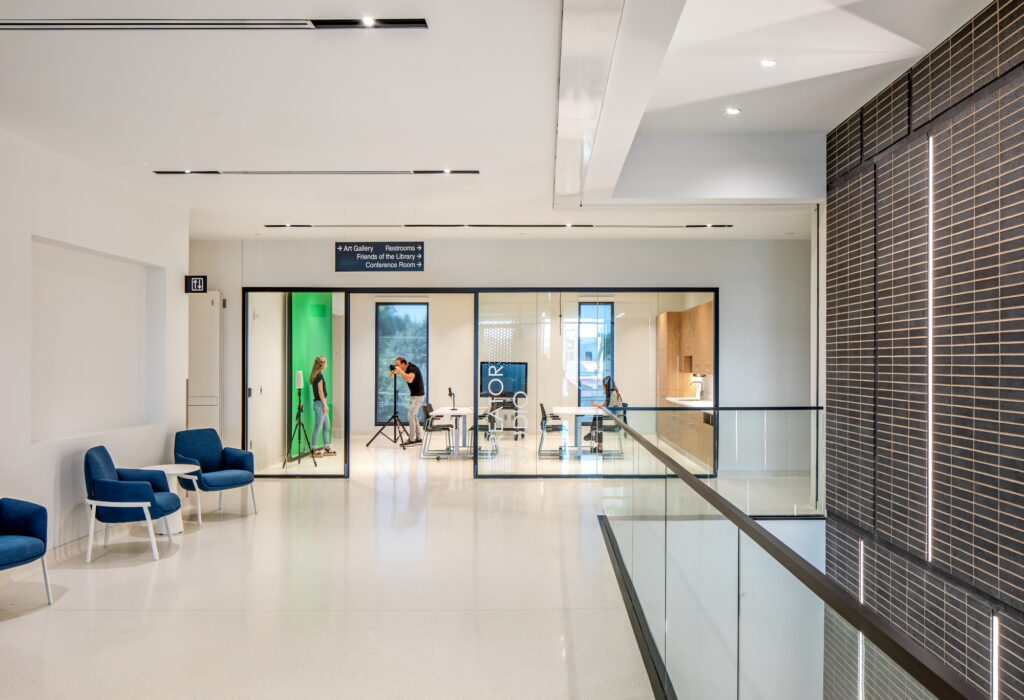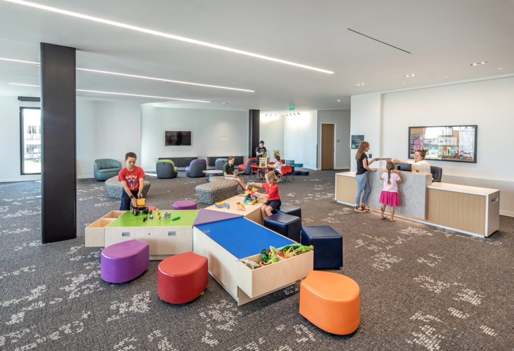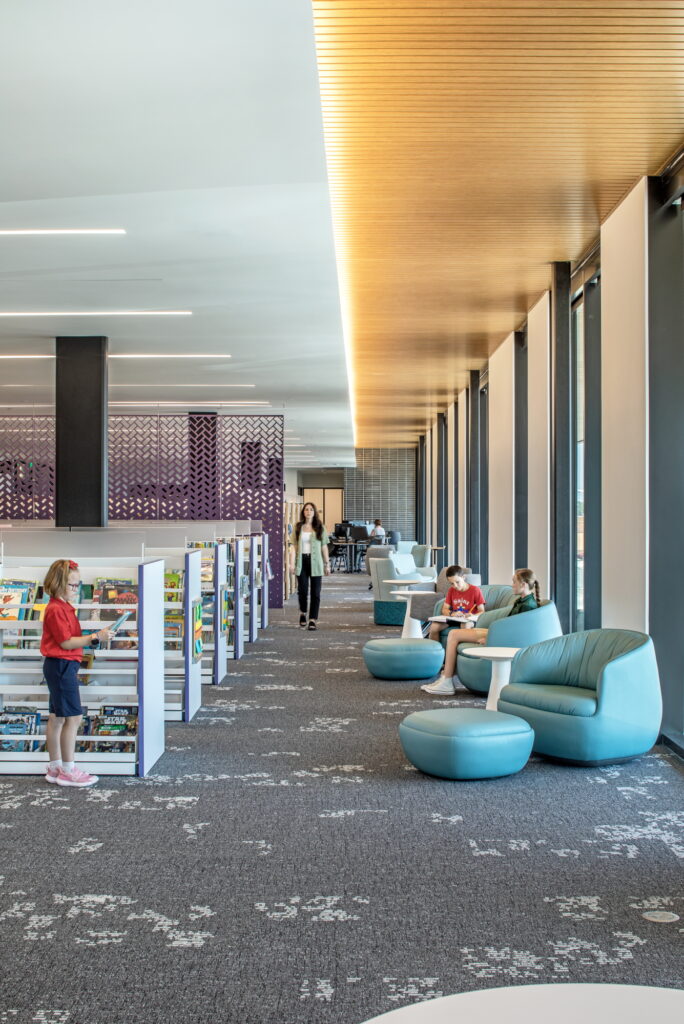 The facility includes a state-of-the-art library, a flexible community room with a teaching kitchen, and a dynamic two-story children’s exhibit area designed to encourage exploration and creativity. Additional amenities, such as a coffee shop and outdoor learning and play environments, extend the experience beyond the building, all unified by a prominent front porch that reinforces the facility’s role as a community gathering place.